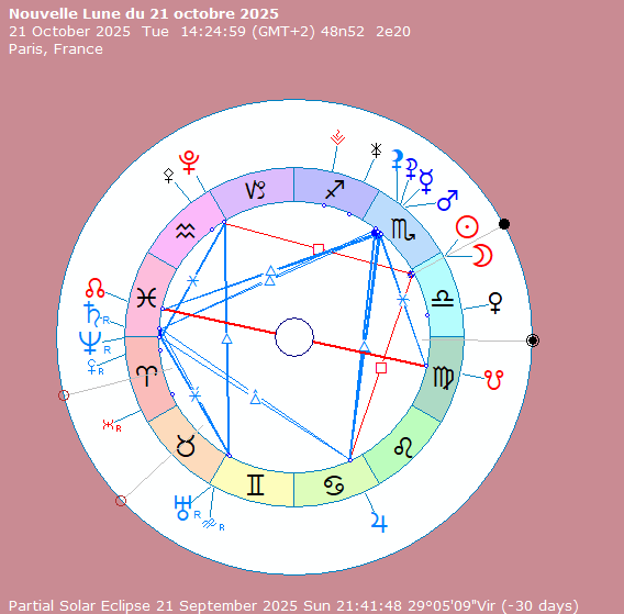 Globalement, si l’essentiel des relations entre les astres et points énergétiques du ciel de cette Nouvelle Lune du 21 octobre 2025 est plutôt harmonique, il y a toutefois quelques tensions, notamment entre notre énergie vitale et notre humeur, d’une part, et les énergies de la famille.